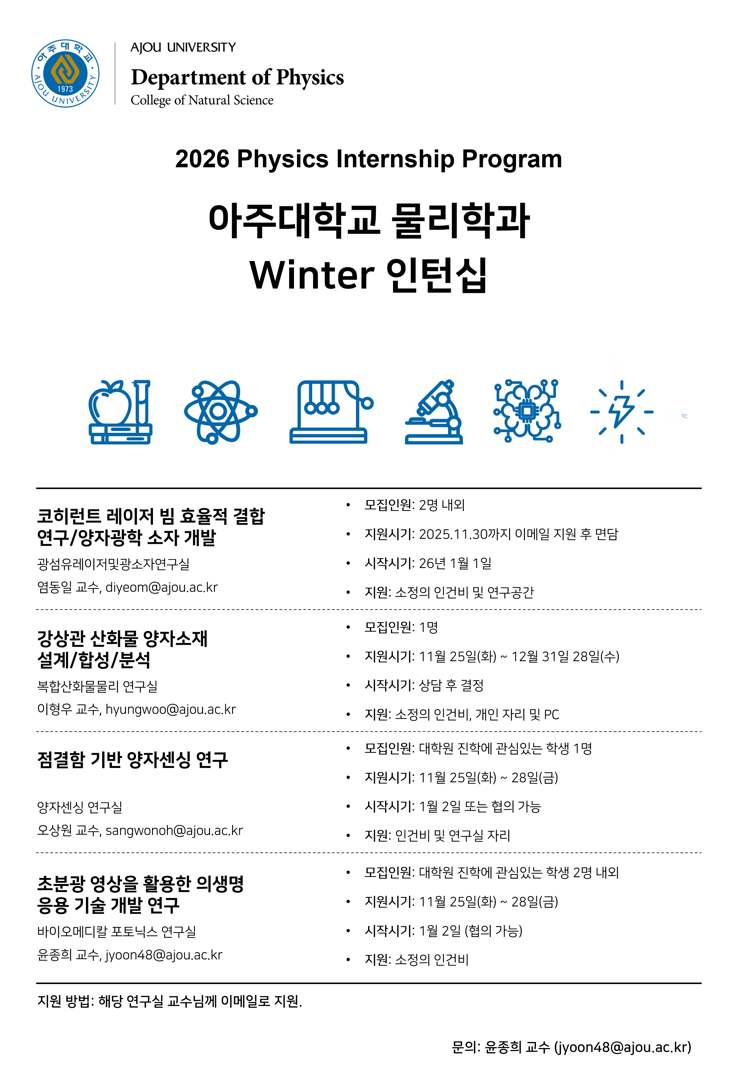 2026년도 아주대학교 물리학과 WINTER 인턴십 모집 공고의 내용을 아래와 같이 안내드립니다